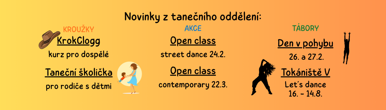 Přijďte si vyzkoušet rozličné taneční styly, užít si veselé pohybové hry a experimentovat s tanečními pomůckami, které podporují kreativitu a radost z pohybu. Sraz: 8:00-8:30 DDM JH, Růžová 10 Ukončení: 15:30-16:00 DDM JH, Růžová 10